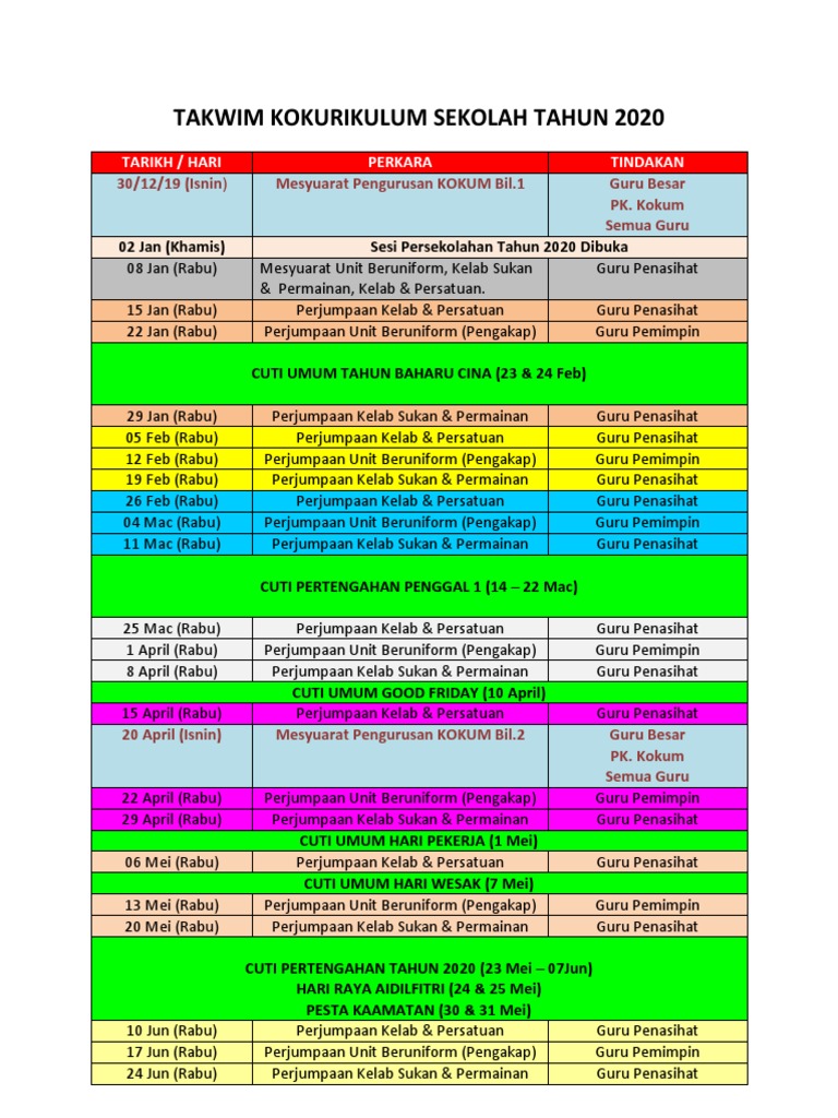 Takwim Kokurikulum Tahun 2020 Pdf